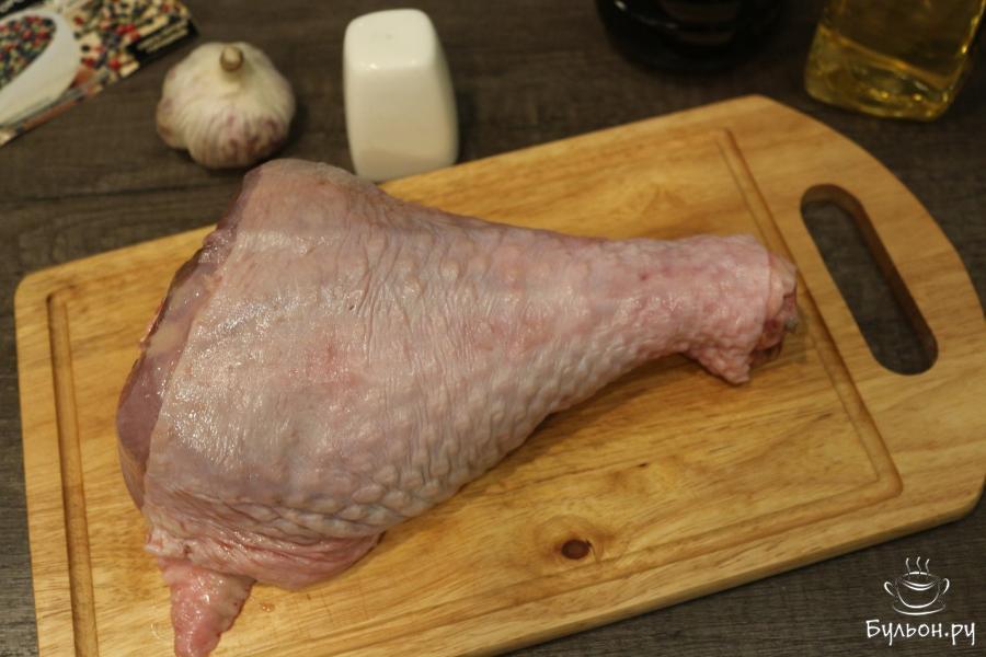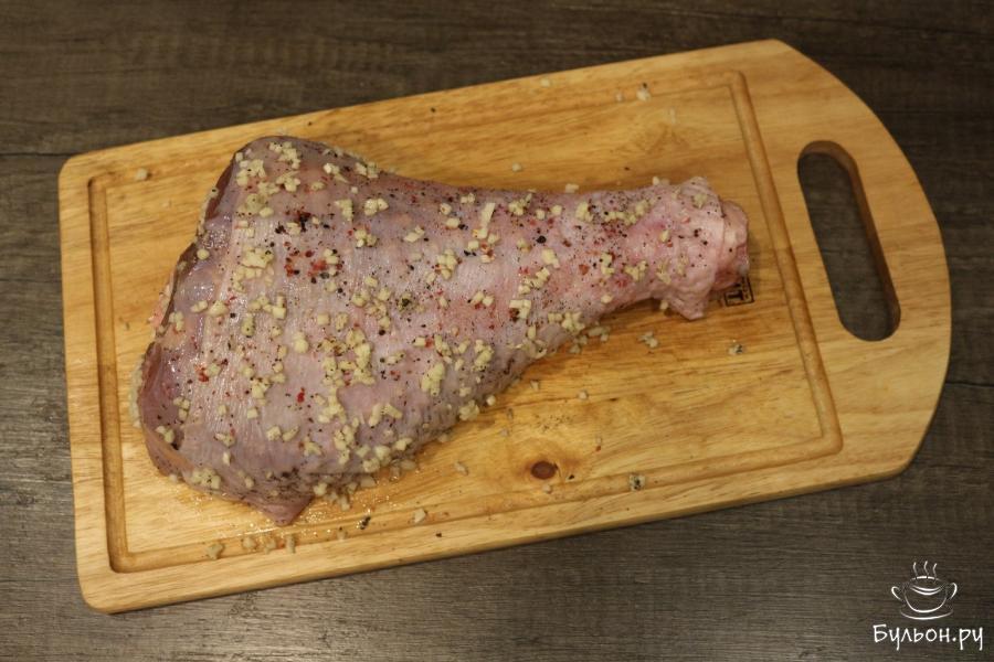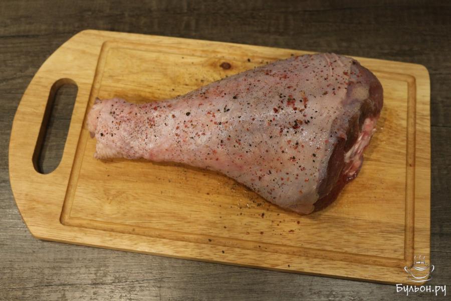 2. Мясо индейки моем, после чего промокнем со всех сторон его бумажными полотенцами, чтобы не было на голени воды. Берем специи и соль, делаем так, чтобы голень была покрыта ими со всех сторон.