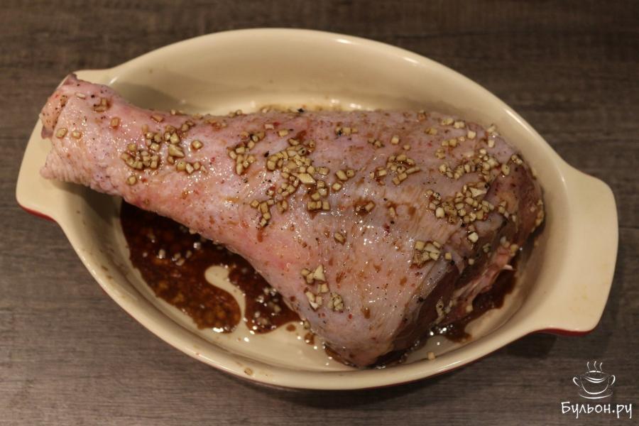 5. Приготовленным маринадом хорошо промазываем индейку. Здесь можно воспользоваться силиконовой кисточкой. Голень перекладываем на блюдо, накрываем его полностью и маринуем в холодильнике. Я оставляю с вечера и на всю ночь. Это где-то 15 часов.
