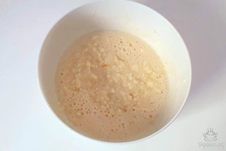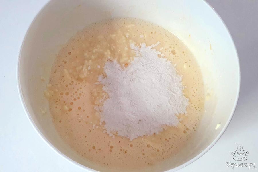 5. Всыпать рисовую муку, разрыхлитель, ванильный сахар и соль. Перемешать, получится густая масса. При необходимости, можно добавить еще немного молока, не больше 2 столовых ложек.
