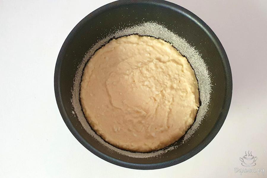 6. Форму, диаметром 16 см, смазать сливочным маслом, присыпать манкой. Выложить подготовленную смесь.