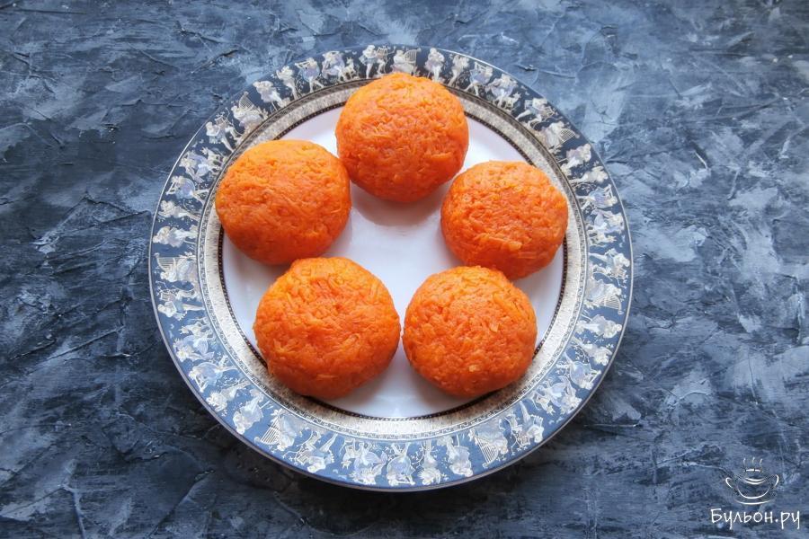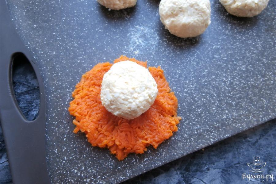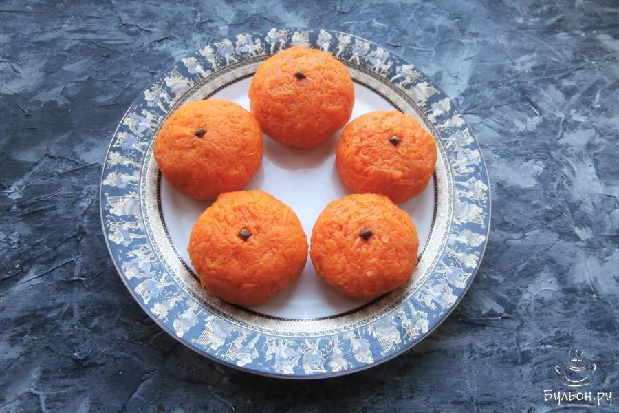7. Полностью покрыть сырные шарики морковкой, чтобы не было видно белых просветов, придавая закуске форму мандаринок.