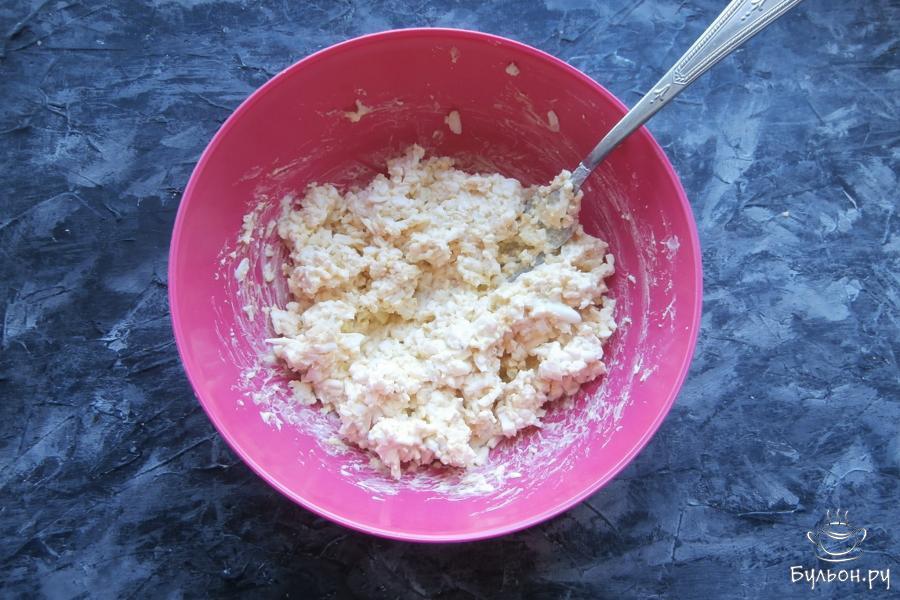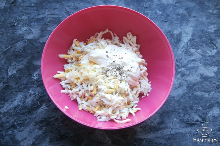 2. Предварительно сваренные яйца также, натереть и добавить к сыркам вместе с измельченным чесноком, солью (если нужно), майонезом и перчиком.
