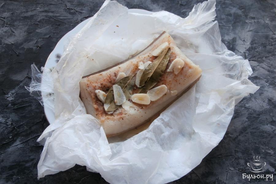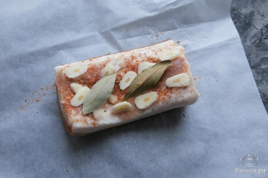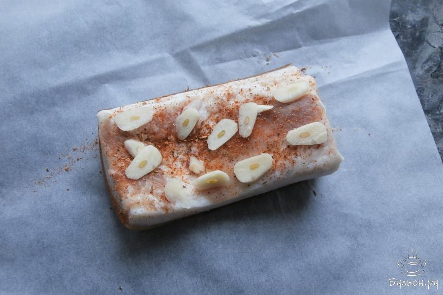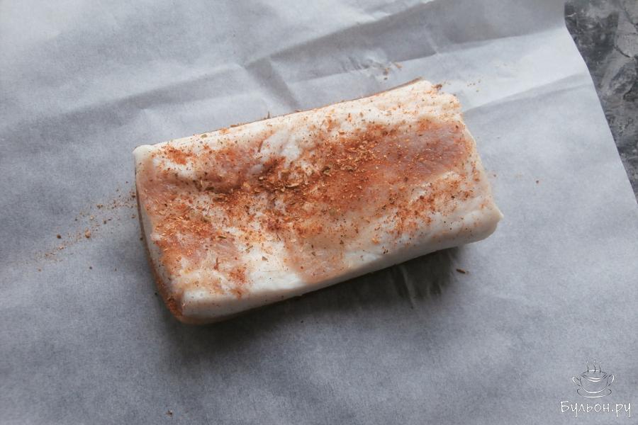 1. Сало нужно хорошо помыть, почистить ножом шкурку, обсушить. Натереть его приправой для мяса, а лучше - приправой для сала, солью и поперчить по своему вкусу. Разместить сало на листе пергамента.