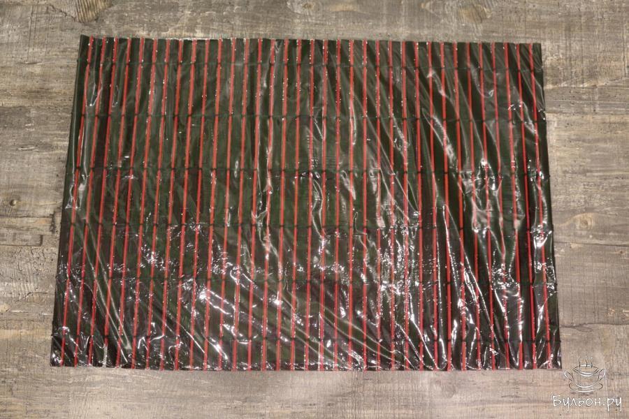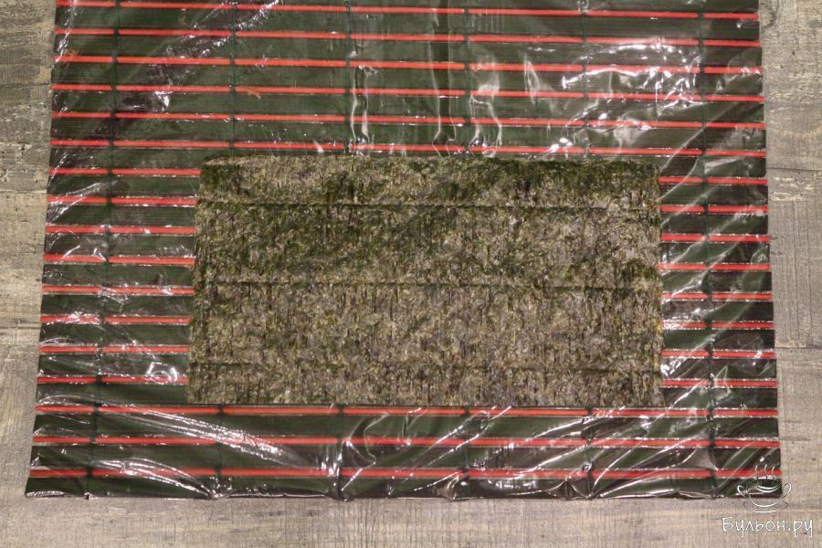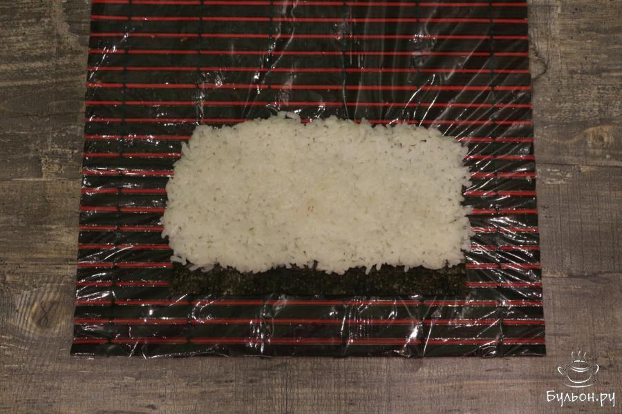 6. 150 грамм риса равномерно распределяем на половинку листа нори так, чтобы рис на 1 см. выступал за лист нори, а с другой стороны, наоборот, на 1 см. меньше листа нори.