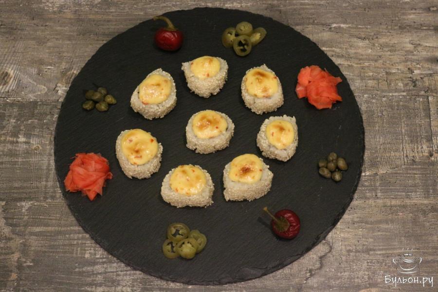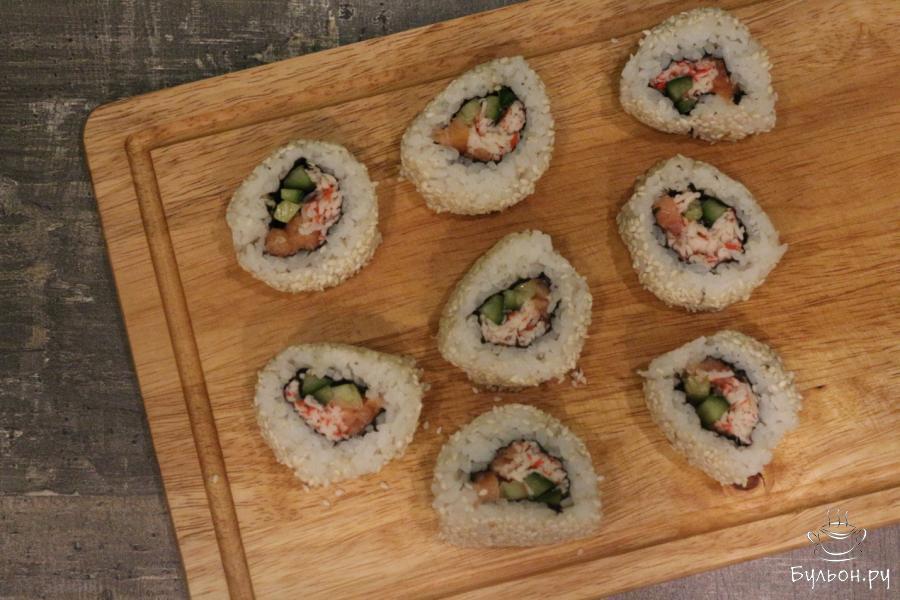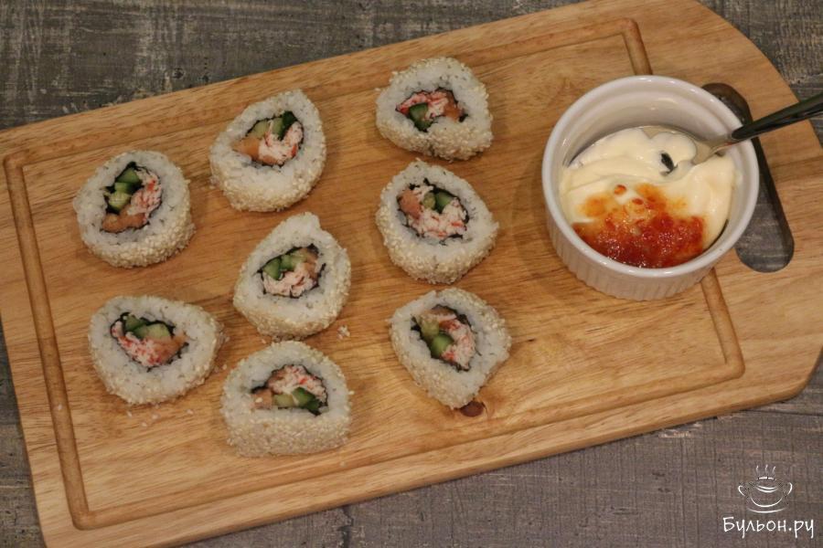 Запеченные роллы с лососем, крабовым мясом и огурцом - это нежная, сытная слабосоленая красная рыбка, легкое приятное по консистенции крабовое мясо, свежий хрустящий огурчик, вкусный мягкий рис, кунжут, морские водоросли, и все это с острой розовой шапочкой. Роллы получаются как в ресторане, очень вкусными и красивыми. В данном рецепте указаны ингредиенты для одной порции роллов, но вы смело можете готовить сразу несколько.