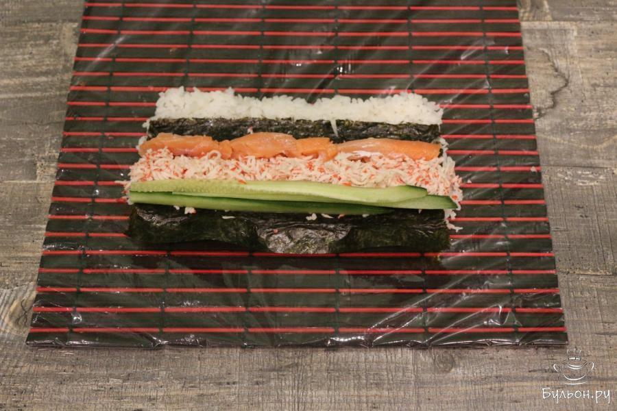 7. Крабовое мясо трем на мелкой терке, лосось слабой соли нарезаем продолговатыми полосками, огурец тонкой длинной соломкой. Переворачиваем конструкции так, чтобы рис был снизу. Теперь выкладываем сверху начинку. В середину кладем крабовое мясо, а по сторонам от него выкладываем лосось и огурец.