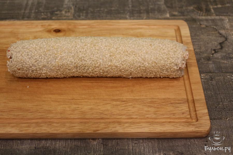 8. Придерживая начинку, заворачиваем ролл в направлении от себя. Аккуратно прокручиваем ролл, подбиваем края и боковые стороны, чтобы он стал ровным и круглой формы.