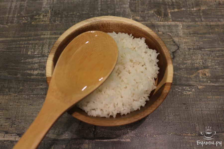 3. Берем ковш, в него вливаем уксус и всыпаем соль с сахаром. Растворяем сыпучие составляющие на слабом огне до их полного растворения. В деревянной мисочке смешиваем рис с теплой заправкой, затем сверху кладем мокрое полотенце и таким образом полностью остужаем крупу.