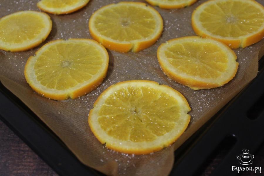 5. Из проваренных апельсинчиков удалим косточки и выложим их на противень, который застелен пекарской бумагой. Посыплем апельсинчики сахарным песком. Подсушим наши апельсинчики в разогретой до 150 градусов духовке. На этот процесс уйдет примерно 15 минут.