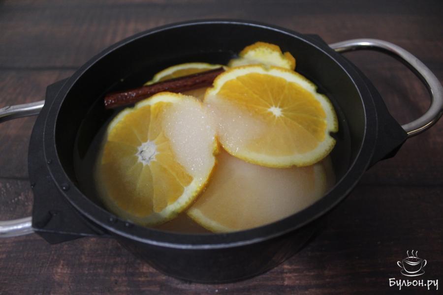 4. В ковшик выложим кружки апельсинов, палочку корицы, зальем водой и засыплем сахаром. Поставим на огонь и проварим апельсины в сиропе после закипания в течение 20 минут. При этом огонь при варке должен быть средним. В процессе варки помешиваем наши кружки, чтобы они полностью проварились в сиропе.