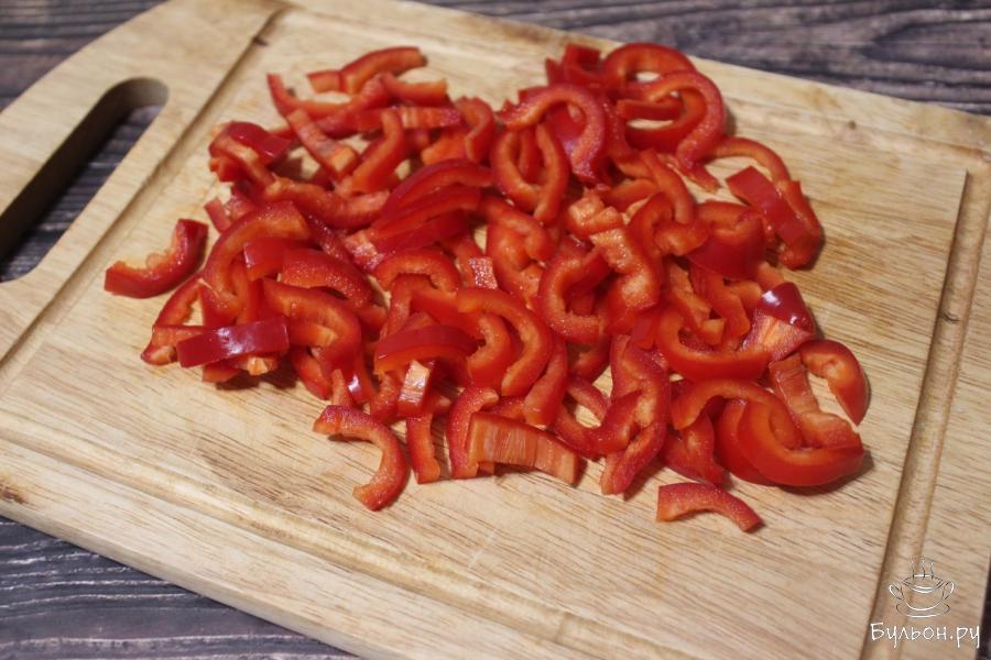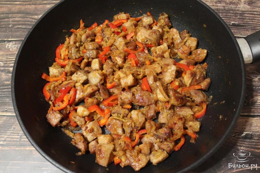 7. К закарамелизованной свинине выложите яблоки и немного потушите. После чего добавьте ломтики перца и еще немного потушите. Свинина в медово-яблочной подливе готова.