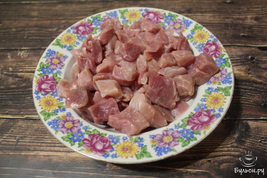 2. Нежирную свинину (карбонад, вырезку) промойте, обсушите и достаточно крупно нарежьте, как на фотографии.
