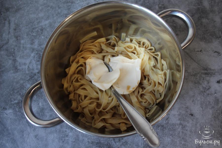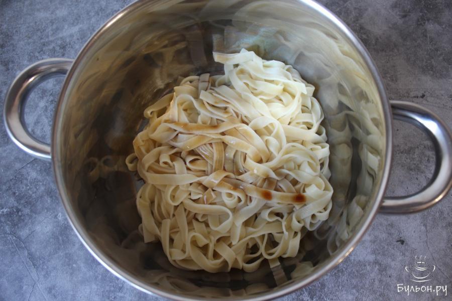 2. В несоленой воде отвариваем пасту в соответствии с инструкцией на упаковке. Возможно, соль вообще не понадобится. Все зависит от солености выбранных соевого соуса и плавленого сыра.