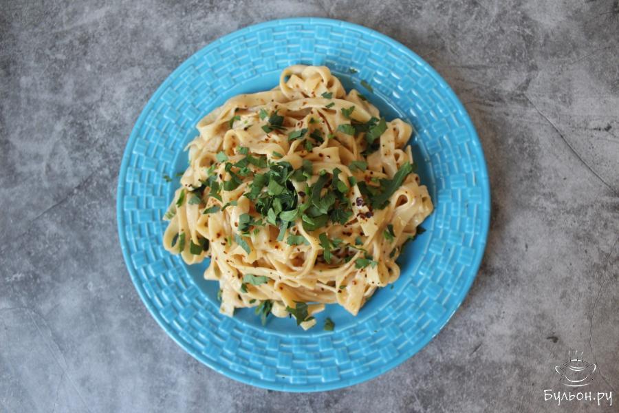 5. Попробовав пасту, определите на свой вкус, стоит ли ее подсаливать. Откорректировав соленость пасты, раскладываем ее по тарелкам и в горячем виде подаем на стол.