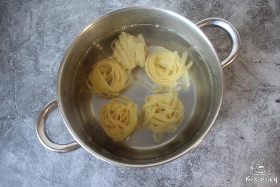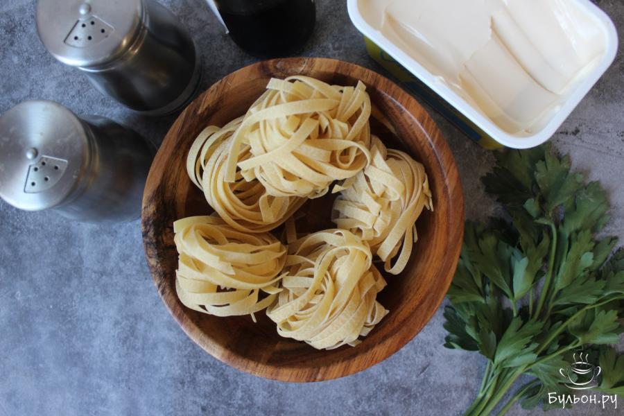 1. Возьмем ваш любимый вид пасты, у меня сегодня тальятелле. Также подготовим все продукты, которые нам необходимы для приготовления пасты.