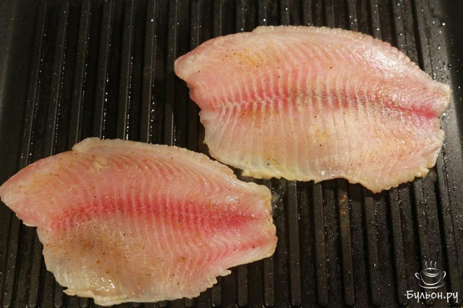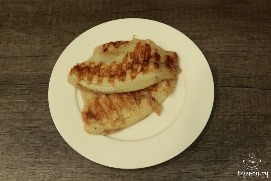 4. Затем кусочки рыбы отправляем на разогретую поверхность гриля и жарим рыбку до образования золотистых полосочек на ней.
