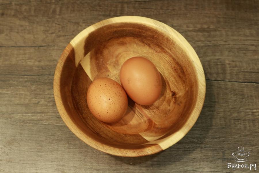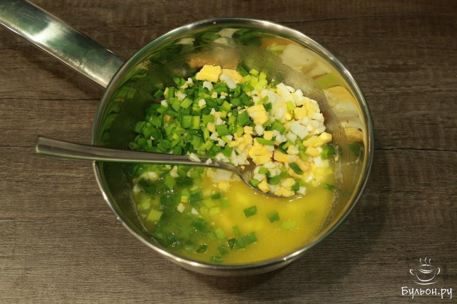 5. В это время готовим соус для рыбы. Яйца чистим и нарезаем мелкими кубиками. Зеленый лучок нарезаем полукольцами.