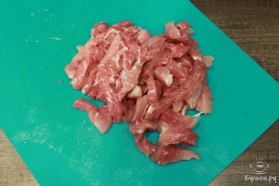 1. Начнем приготовление салата с мяса. В начале нарежем свинину. Это будут небольшие продолговатые кусочки.
