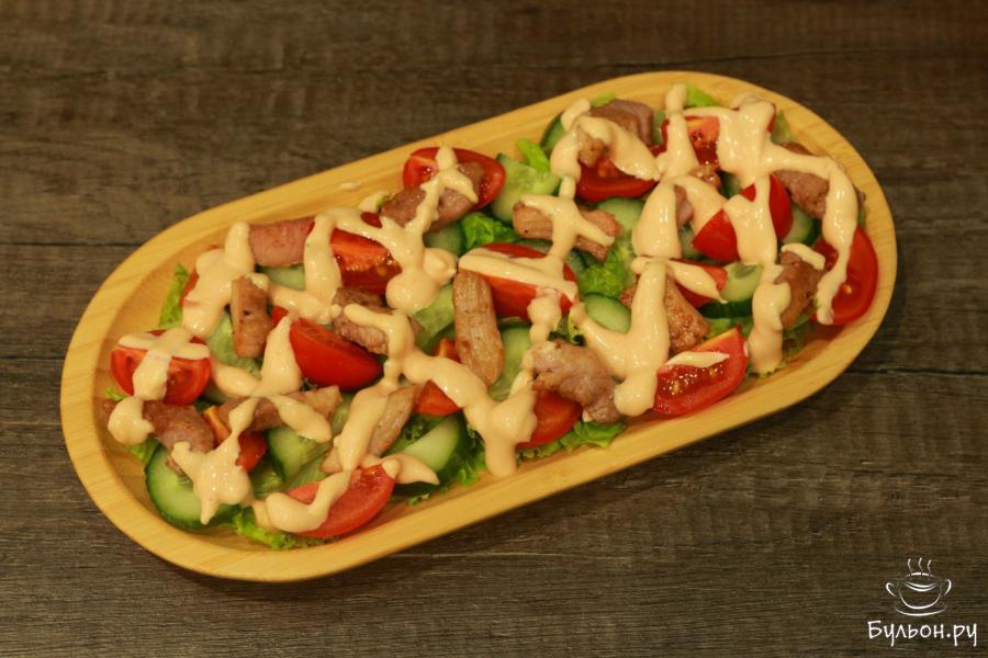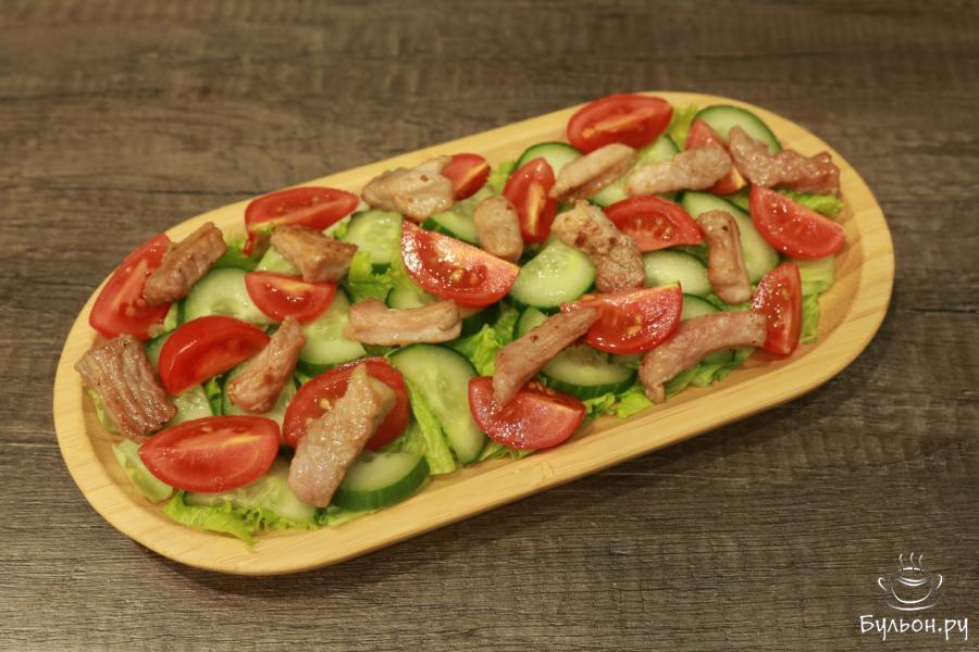 Если вам не хочется делать тяжелые майонезные салаты, то предлагаю приготовить легкий салат со свининой на праздничный стол. В нем только плюсы. Во-первых, он очень быстро готовится. Во-вторых, кроме того, что быстро, еще и очень просто. В-третьих, он легкий, в нем много овощей. Это салат, помидорки, огурчики. В-четвертых, если его еще и правильно оформить, то получится еще и красиво, по-праздничному.