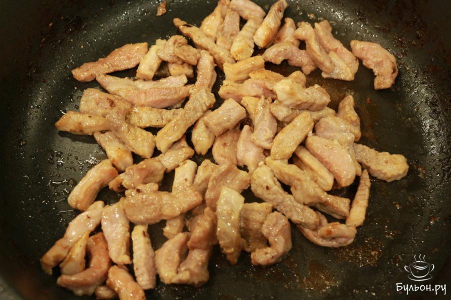 2. Мясо обжарим на сильном огне с добавлением растительного масла, чтобы оно не стало сухим. Минут 8-10, не больше, до легкого золотистого цвета. Сильно не жарьте, иначе оно потеряет свою мягкость.