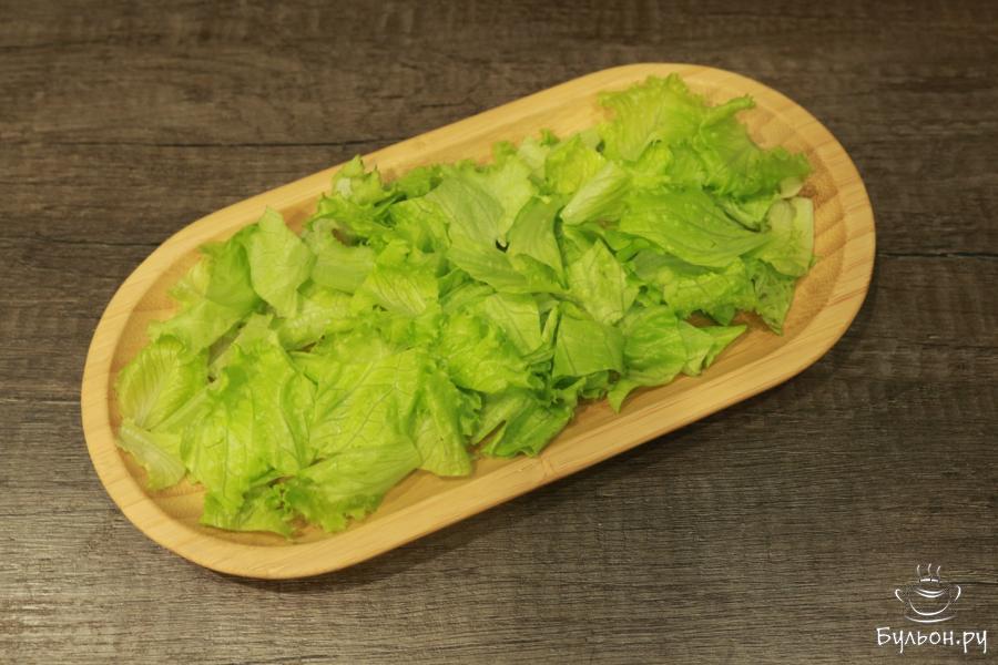 3. Теперь займемся овощами. Берем блюдо или тарелку, в нее кладем нарезанные и порванные на кусочки листья салата. Листочки должны быть среднего размера.