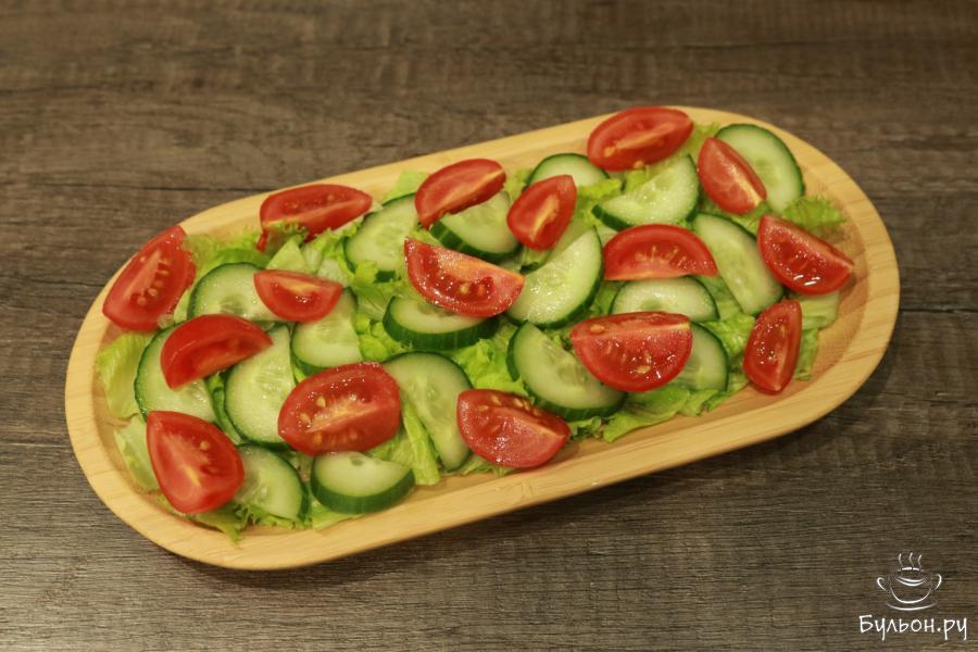 4. Огурцы и черри режем не крупно, средними кусочками, как на фото. На листья салата сверху укладываем в начале кусочки огурчиков, затем нарезанные на четвертинки помидоры черри.
