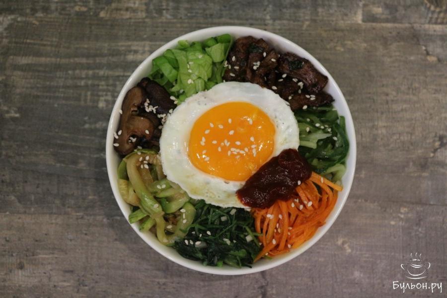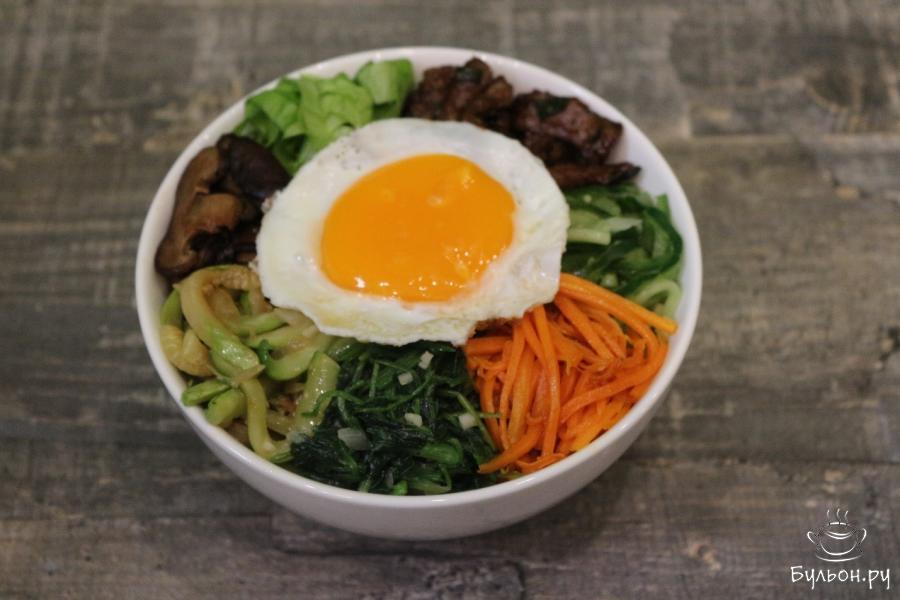 13. Берем чашу, в которую выкладываем рис. На рис кладем все закуски по очереди. В центр сверху кладем жареное яйцо.
