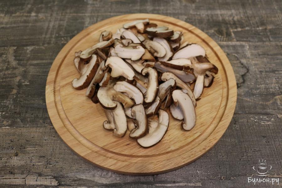 10. Грибы шиитаке моем, после нарезаем пластинами, которые выкладываем на сковороду и обжариваем с добавлением масла. В конце вливаем немного соуса соевого.