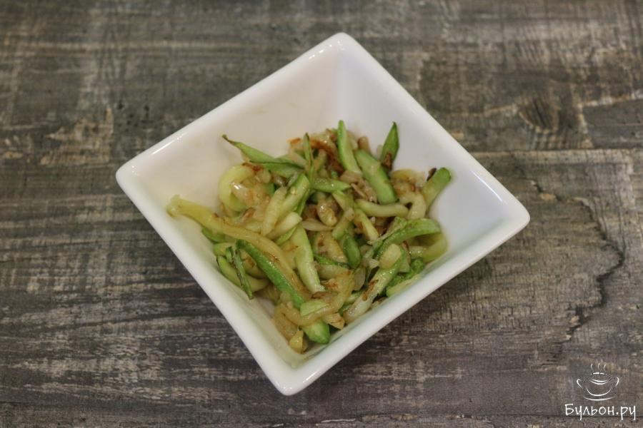 7. Далее немного отжимаем полосочки кабачка, перекладываем в емкость в которую кладем половину столовой ложки лука, четверть чайной ложки рубленого чеснока. Смешиваем все ингредиенты и быстро обжариваем.