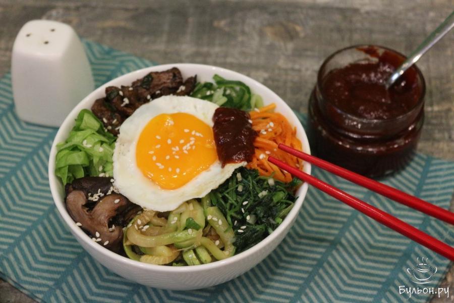 Пибимпап - это очень разнообразное, полезное, богатое по ингредиентам, красочное по подаче, популярное корейское блюдо. На самом деле, в Корее часто пибимпап готовят из тех продуктов, которые остались у хозяйки, и из тех, что имеются под рукой в наличии. Это блюдо состоит из риса, на который выкладываются различные закуски и говядина, а в центр кладется яйцо. Заправляется пибимпап перцовой корейской пастой кочхучжан. Перед употреблением это блюдо необходимо перемешать, ведь, если перевести на русский язык, то это блюдо называется в прямом смысле смешивание риса.