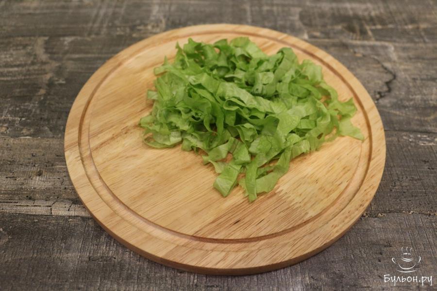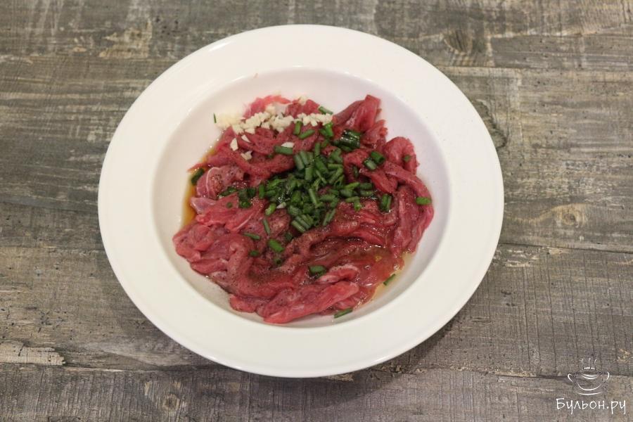 2. Мясо режем на длинные полоски. Кладем их в миску, в нее добавляем следующие ингредиенты: нарезанный зеленый лучок, щепотку чеснока, перец, половину столовой ложки соевого соуса, мед, столовую ложку кунжутного масла. Маринуем мясо полчаса, после обжариваем минут 5.