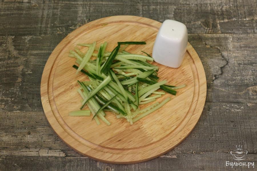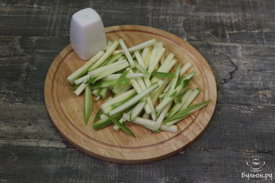 6. Режем кабачок полосочками, подсаливаем их и оставляем на некоторое время, чтобы кабачок дал сок. Минут 15.
