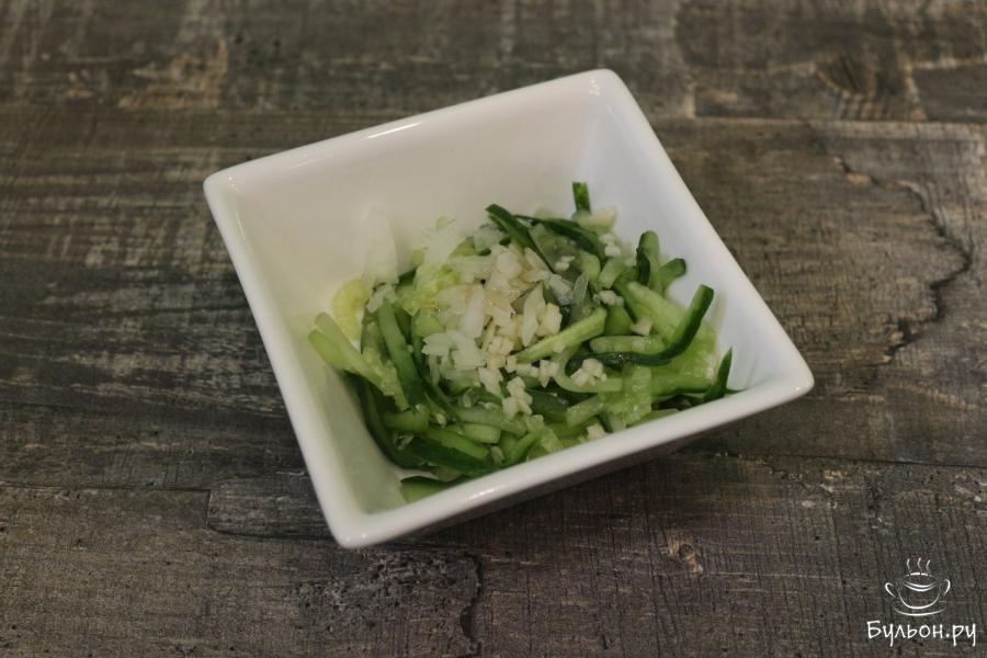 9. Далее немного отжимаем полосочки огурца, перекладываем в емкость в которую кладем половину столовой ложки лука, четверть чайной ложки рубленого чеснока. Смешиваем ингредиенты.