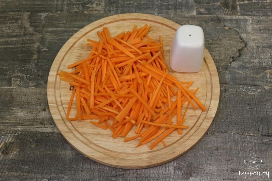 3. Морковь превращаем в соломку длиной 5 см. Ее солим и жарим на сковороде. Внимание. Все ингредиенты жарятся на сильном огне, поэтому времени понадобится примерно по 3-5 минуток на каждый ингредиент.