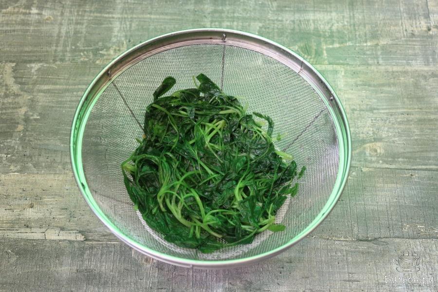 4. Листочки шпината моем, после чего бланшируем в подсоленной воде примерно 40 секунд. Потом откидываем на дуршлаг и промываем водой холодной.