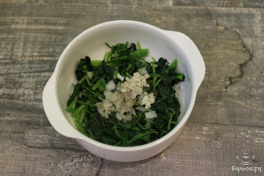 5. Отжимаем листья шпината, режем его на средние кусочки, добавляем к нему соль, перец, кунжутное масло, по половине чайной ложки лука и чеснока. Смешиваем все вместе.