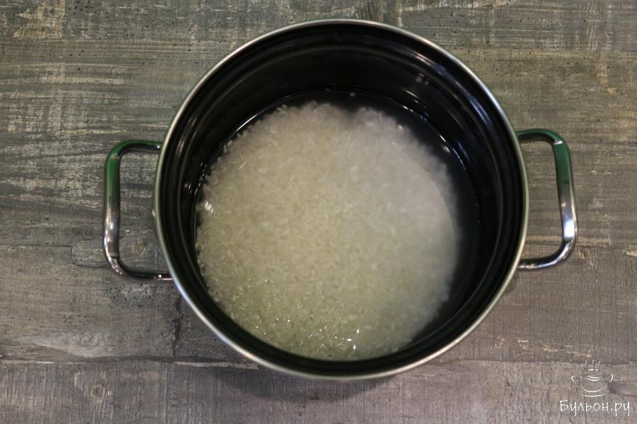 1. В первом шаге сразу же измельчим лук и чеснок. Они понадобятся во многих шагах дальше. Рис промываем 3 раза, заливаем водой на полчаса. Далее варим рис под крышкой на медленном огне 20 минут в чуть подсоленной воде в соотношении 1 к 1. Затем рис оставляем под крышкой еще на 10 минут.
