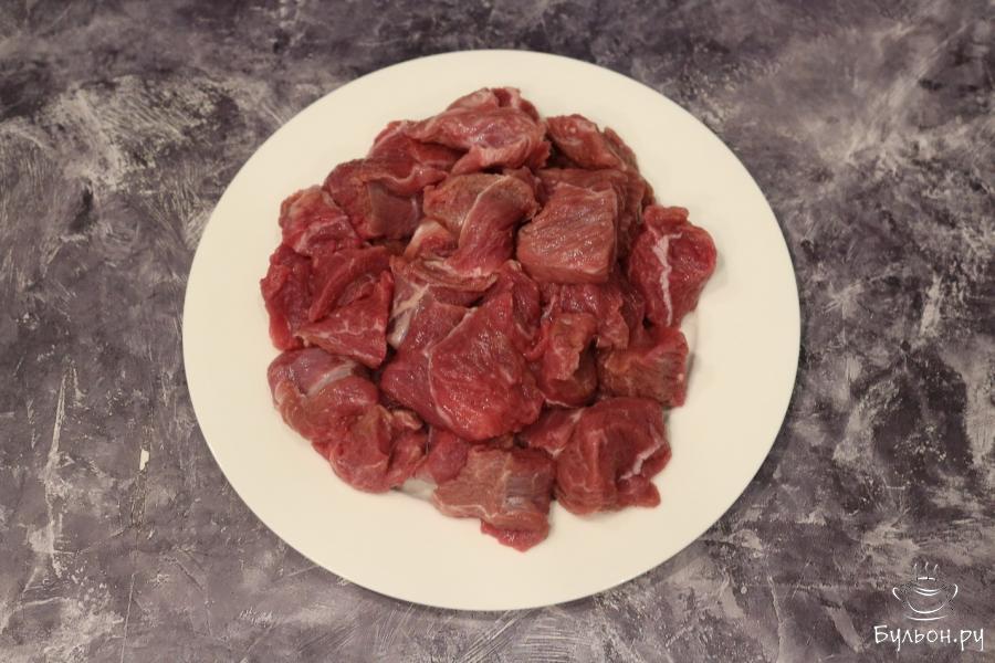 1. Подготовим все составляющие, которые пригодятся для приготовления харчо. Говядину моем, убираем с нее лишнюю влагу и нарезаем. Кусочки должны быть среднего размера где-то 2-3 см.