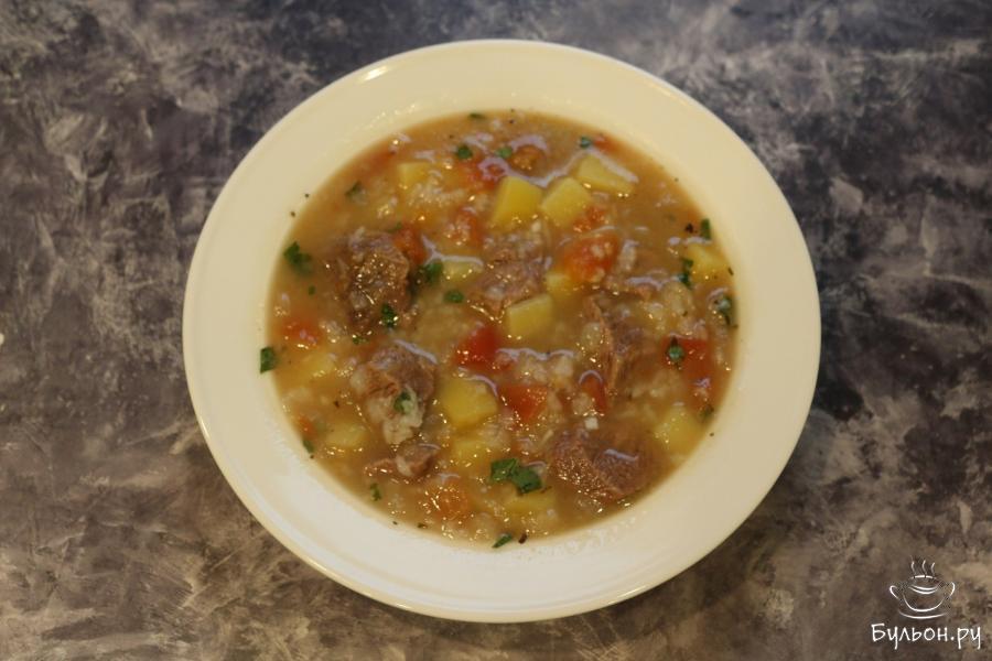 грузинская Харчо с рисом и картофелем - это суп, который будет идеальным на столе в осеннее и зимнее время, то есть в пасмурную и холодную погоду, так как, во-первых, он очень наваристый, поэтому получается очень сытным и, во-вторых, суп получается согревающим, поскольку в нем содержатся приправы в довольно большом количестве. В тарелке суп смотрится богато, у него красивый, насыщенный, яркий цвет и в нем содержится довольно большое количество ингредиентов.