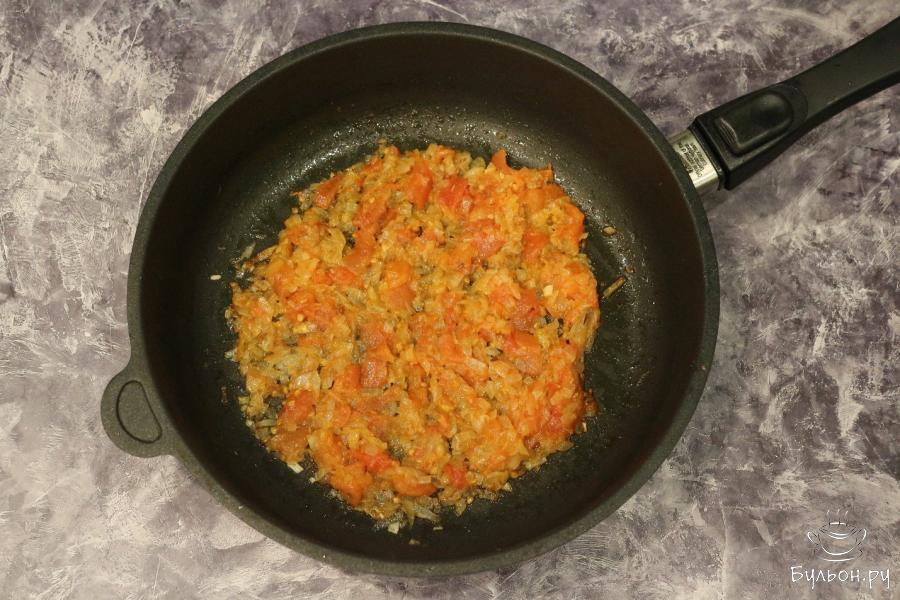 6. В сковородку вливаем масло, выкладываем лук, жарим пару минуток. Затем выкладываем к луку половину нарезанных помидоров. Тушим около 7 минут.