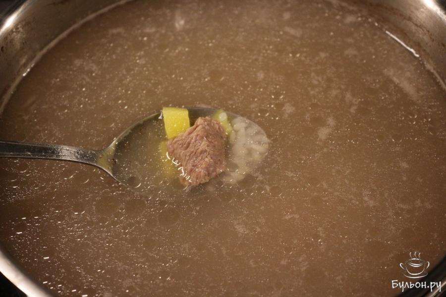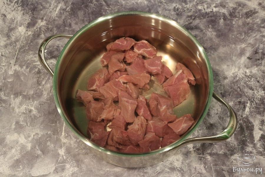 2. Кусочки говядины перекладываем в кастрюлю, добавляем воду. Ингредиенты доводим до кипения, после чего варим от 1 до 1,5 часов под крышкой на более слабом огне. Не забываем снимать пену.