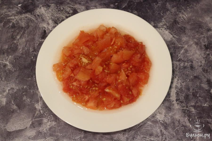 5. В помидорах делаем надрезы и заливаем их кипятком на пару минуток, после чего достаем их, немного остужаем и снимаем кожицу. Нарезаем помидоры кубиками.