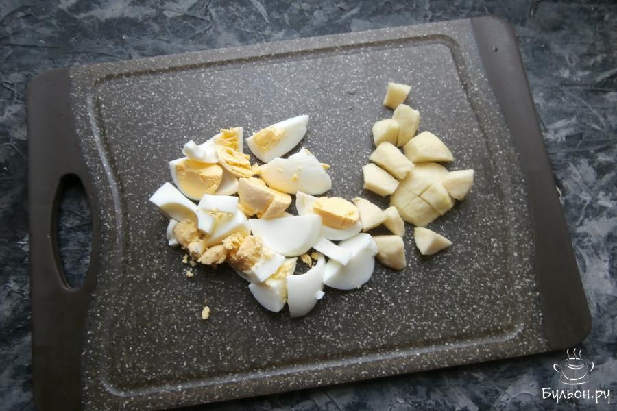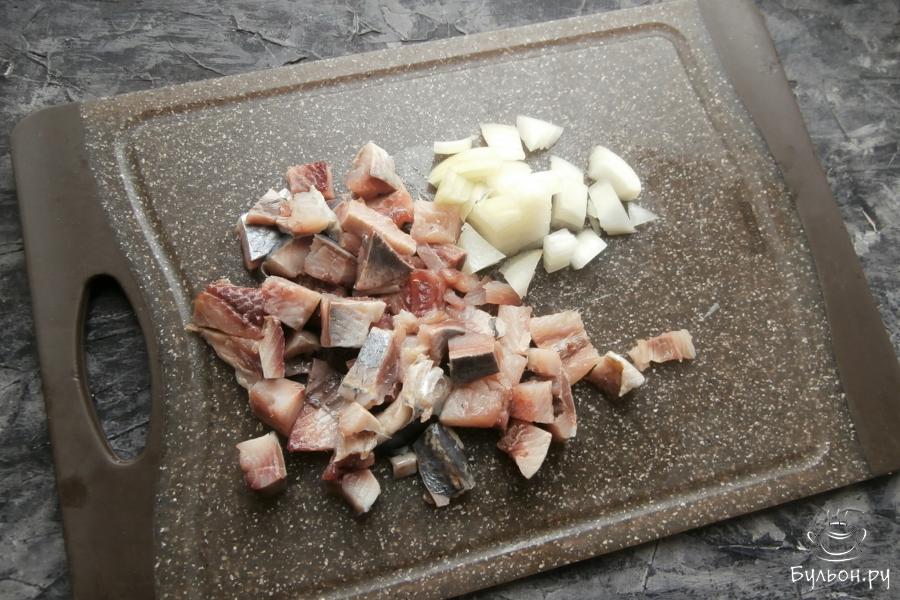 1. Селедку почистить, удалить все кости, отделить филе, порезать его кусочками. Также, кусочками, порезать репчатый лук.