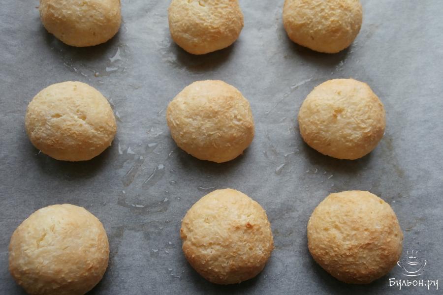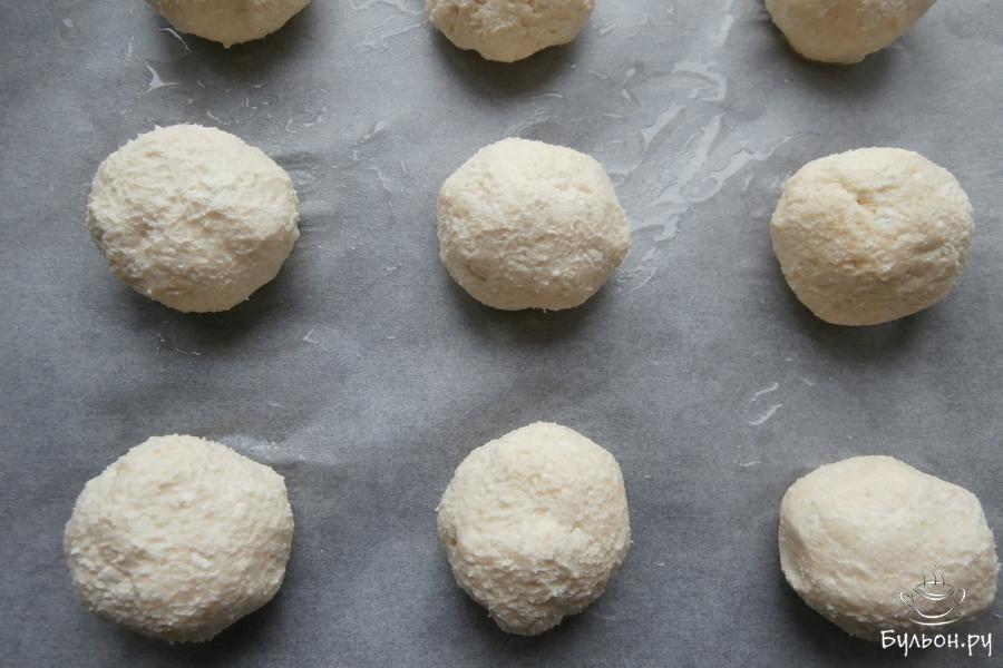 5. Смочив немного руки водой скатать из полученного теста 9-10 шариков, которые выложить на достаточном расстоянии на противень, который застелить смазанным маслом пергаментом.