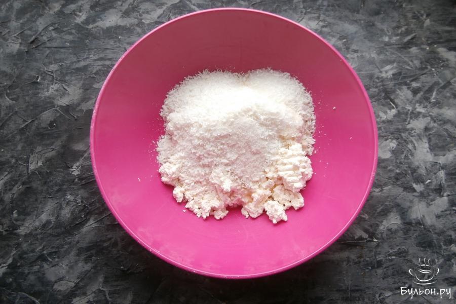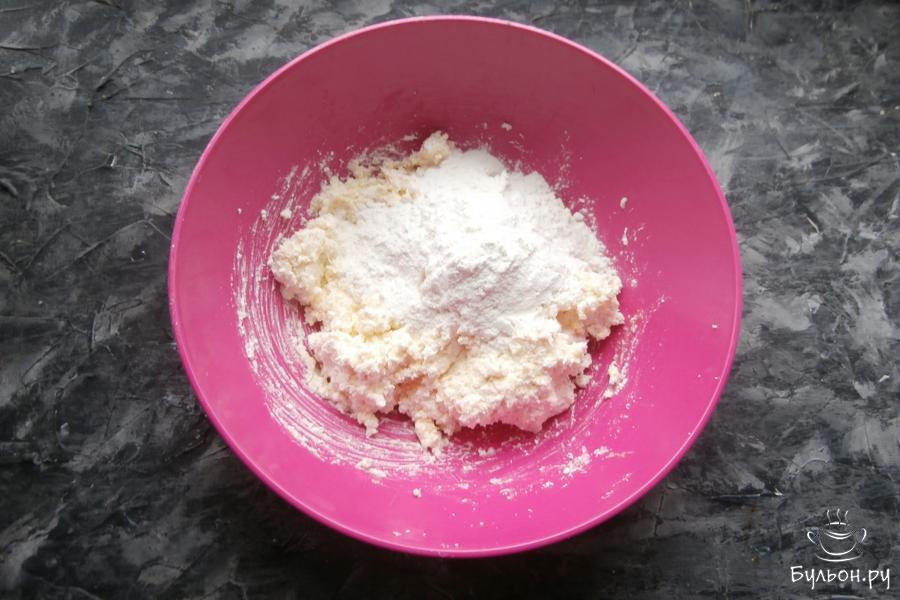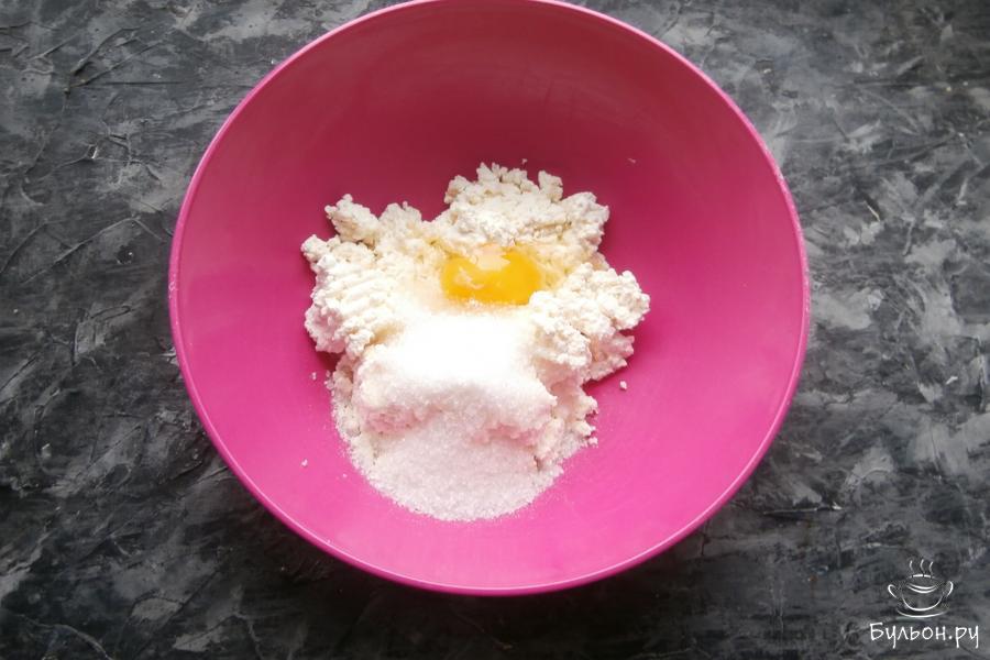 1. Творог поместить в миску, добавить ванильный сахар, обычный сахар, чуточку соли и вбить одно яйцо.
