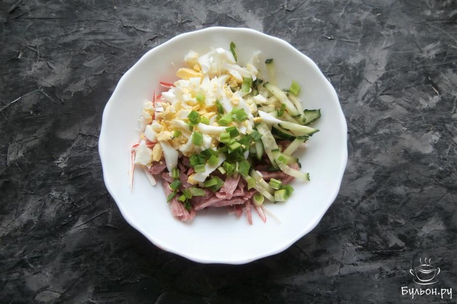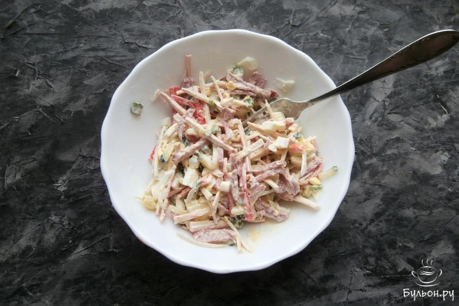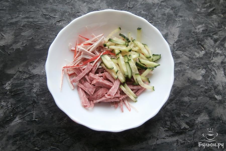 В праздничный, любимый многими салат с крабовыми палочками и кукурузой можно добавлять грибы, мясо, курицу, колбасу и т. д. И в каждом случае вы получите новый, неповторимый вкус салата, не похожего на классический вариант. Предлагаю вам крабовый салатик с колбасой, он очень вкусный, сочный и готовится просто. Вкус у этого салата совсем другой, интересный и не банальный еще и благодаря нарезке продуктов. Колбасу я использовала варено-копченую, можете взять и сырокопченую - отличный вариант.