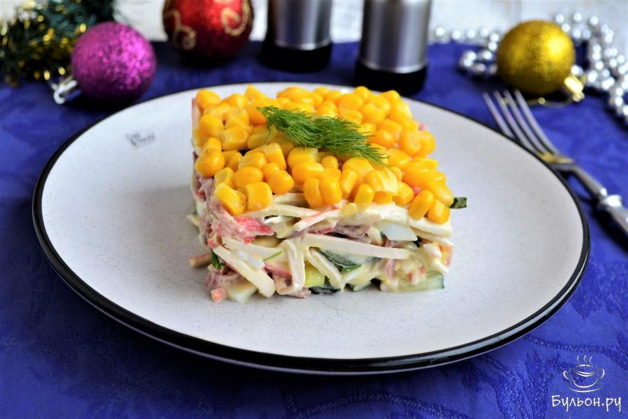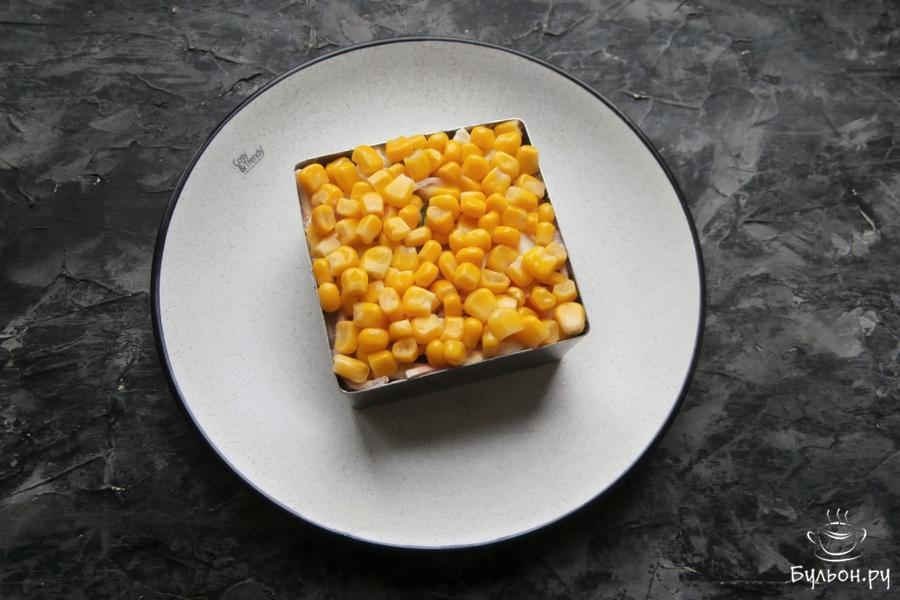 5. Далее, салатик можно выложить на тарелку, формируя его с помощью формочки (кольца или квадрата), сверху выложить слой кукурузы.