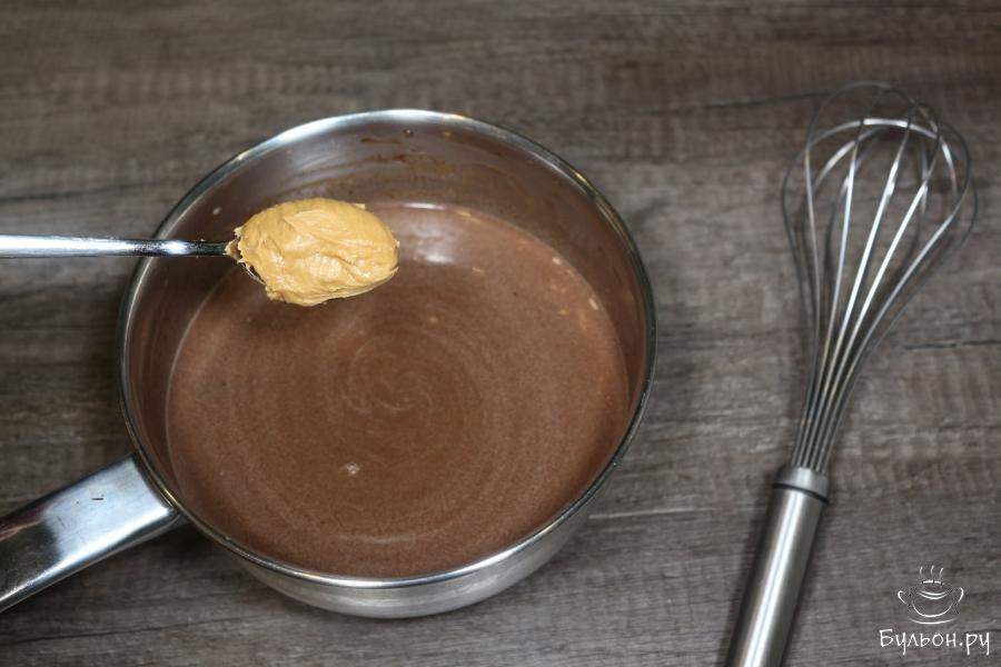 4. Когда это произойдет, добавляем арахисовую пасту и с помощью венчика перемешиваем напиток до полного растворения пасты.