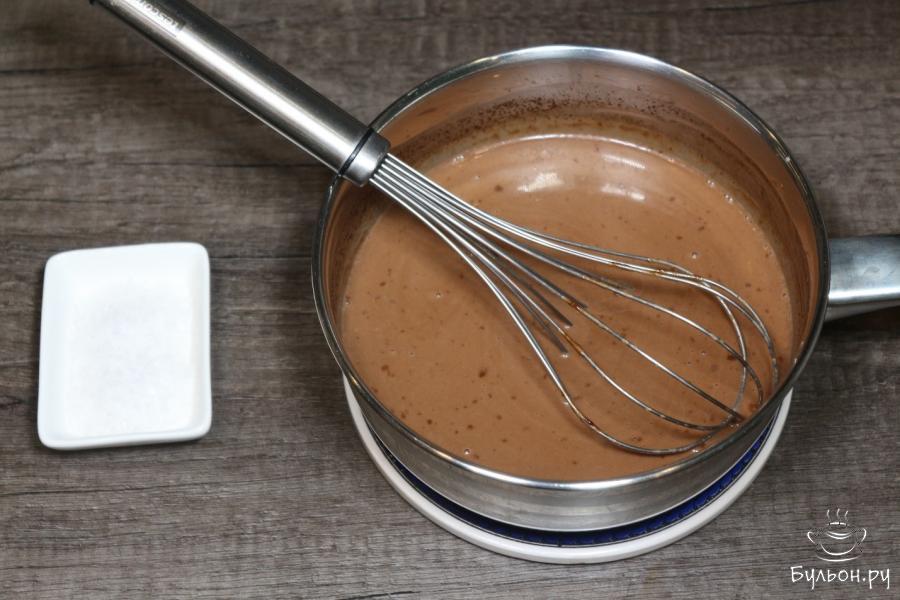5. После этого остается добавить только чуточку соли, чтобы вкус горячего шоколада стал еще ярче. Перемешаем аккуратно еще раз и перельем напиток по стаканам.