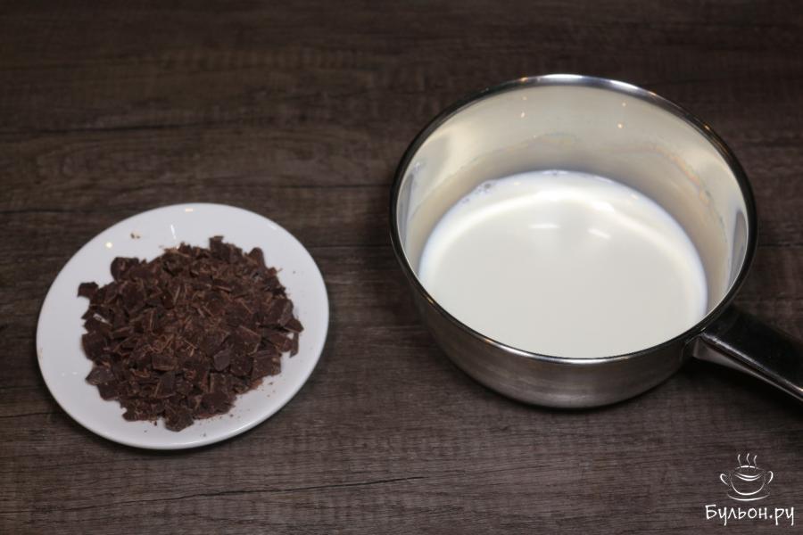 3. Теперь наливаем в сотейник весь объем молока и выкладываем нарезанный шоколад. Ставим на плиту и включаем конфорку на небольшой огонь или мощность. Постоянно перемешиваем ингредиенты, доведя их до однородной консистенции.